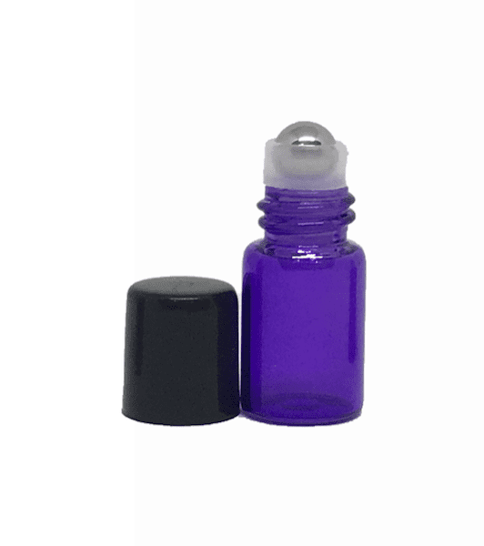 2ml Purple Glass Roller Bottles complete with roller tops and black lids.