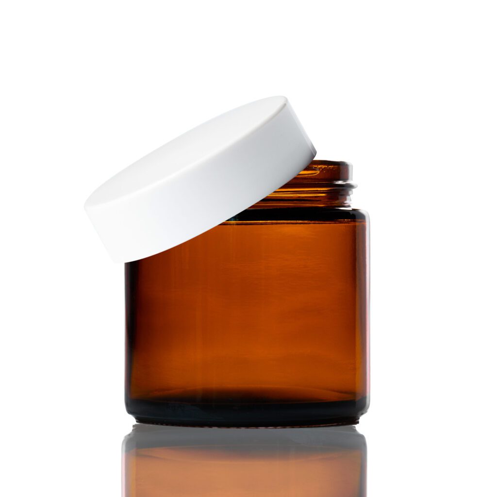 100-120ml Amber Glass Jar – with White Lid and white plastic insert